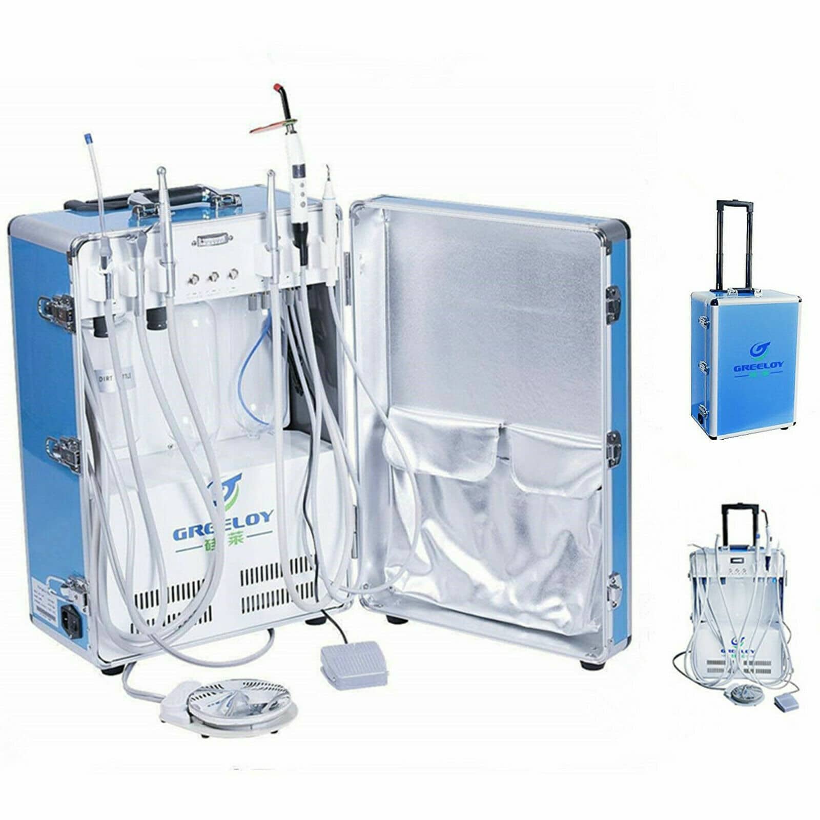 The Greeloy GU-P206 is a compact, integrated dental unit that combines three essential clinical functions into one portable system: an oil-free air compressor, an LED curing light, and an ultrasonic scaler. This makes it an ideal solution for mobile dental practices, outreach clinics, community health programmes, and any setting where a full fixed dental chair setup is not available.