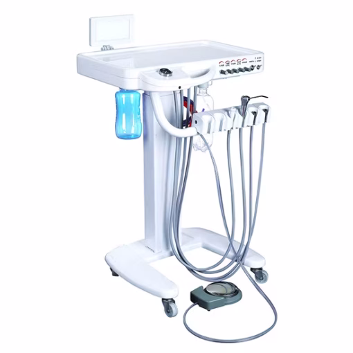 A Mobile Dental Delivery System is a self-contained chairside unit designed to bring the full functionality of a dental treatment setup to any location — without requiring fixed plumbing or permanent installation. Mounted on a mobile base, it can be positioned alongside any dental chair and repositioned as needed across different treatment areas.